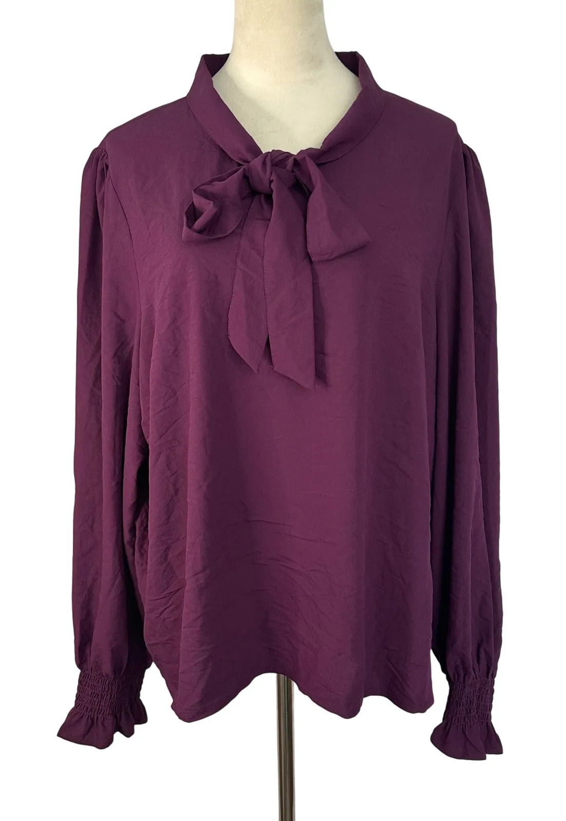 Elevated elegance arrives with this beautiful blouse. A rich, grape hue drenches the textured fabric, creating a sophisticated and eye-catching piece. The high neckline features a charming tie detail, adding a touch of femininity and versatility. Long sleeves with elasticated cuffs create a subtle puff, enhancing the blouse's graceful silhouette. The back features a keyhole opening with a double button closure. Perfect for a polished office look, a chic dinner date, or a special occasion where you want to make a statement. New with tag. $42 retail price Department: Women Material: Polyester Neckline: High Neck Sleeve Length: Long Sleeve Sleeve Type: Features: Elastic Cuffs, Tie Neck, Keyhole Keywords: Princess Highway, Purple Blouse, Tie Neck, Long Sleeve, Size 20, Womens Top, Dressy Blouse, Office Wear, Casual Blouse, Elegant Top, Grape, Lacey Top