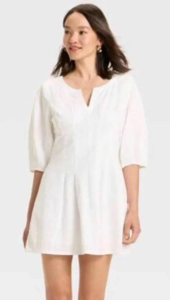 White Measures 21” armpit to armpit 38” waist 35” length Mini A-line dress •Made from cotton-linen b... Show more