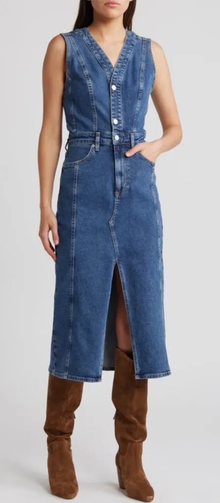 Upgrade denim day with this sleeveless dress that borrows details from your favorite jeans to create a flattering, functional fit. Retails $268 Front button closure V-neck Sleeveless Front scoop pockets; back patch pockets Front vent 99% cotton, 1% elastane Machine wash, tumble dry Made in Turkey