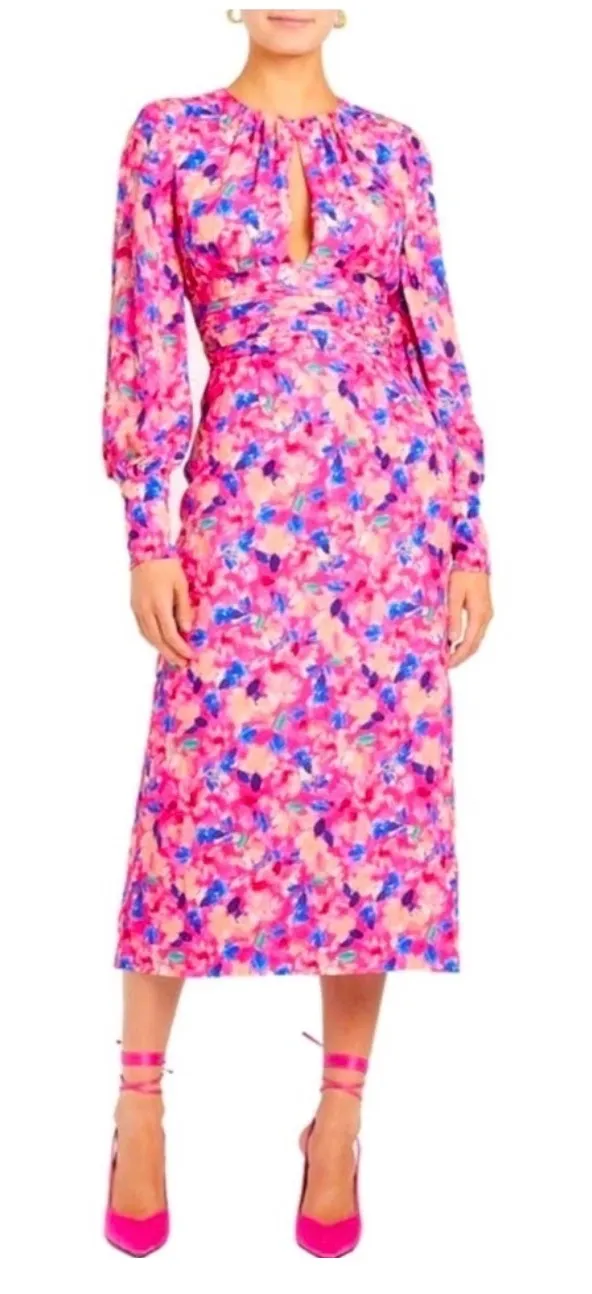 REBECCA VALLANCE Little Havana Floral Long Sleeve Midi Dress Sz 4 $595 Stunning Rebecca Vallance "Little Havana" floral midi dress in shades of pink, blue, and fuchsia. Features long blouson sleeves, a keyhole neckline, fitted waist, and a flowing midi skirt. Beautiful for daytime or evening events. Size 4. Measures 18" pit to pit 52" length New without tags $595