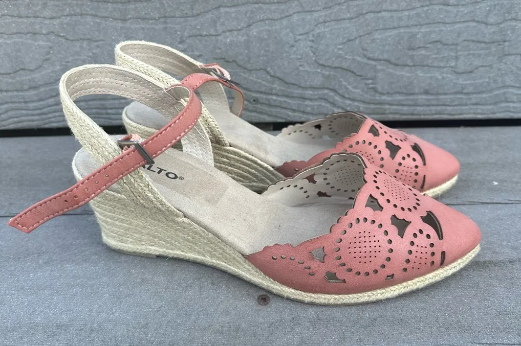 Great condition. Some residue on footbed from the store stick but could probably be cleaned up a bit. Sort of a Pink or Mauve Taupe color. Measurements can be provided upon request. I think they are roughly 3" tall but I will double check. Jute covered heel and almond shape toe. Have a lace or crochet look to the toe in my opinion. Ankle strap with buckle closure. SKU 952