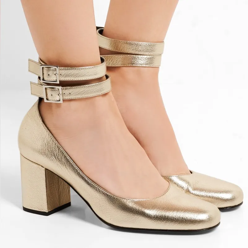 Saint Laurent Paris "Babies" New without box/dust bag, shoes only *minor store/shelf wear including small scratches (please see all photos) women's size US 38.5 RETAIL: $895 muted light champagne gold color + black lining adjustable double ankle strap detail with buckles mid height leather-wrapped block heel edgy mary-jane style pumps heels closed rounded toe made in Italy *approx* 2.75" comfort heel height (see measurement photo for exact) HBOFC YSL yves designer luxe luxury retro vintage pinup dressy cocktail party formal event special occasion black tie glam glamorous elegant feminine dainty coquette dance disco evening wedding guest bachelorette club clubwear vegas sexy trendy chic going out date night midi edgy grunge punk biker moto photoshoot runway couture avant garde classic classy elevated minimalist 70s 80s 90s 2000s y2k blogger favorite shoes reseller free people anthropologie loveshackfancy mother anine bing aritzia skims abercrombie & fitch theory revolve veronica beard reformation aerie madewell j. crew ralph lauren polo zara aviator nation jenni kayne doen nordstrom