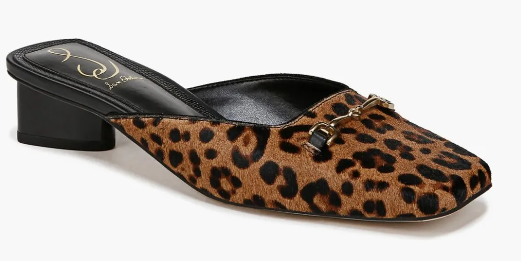 A square toe and low block heel sharpen the style of a sleek mule topped by a glinting bit. 1 1/4"... Show more