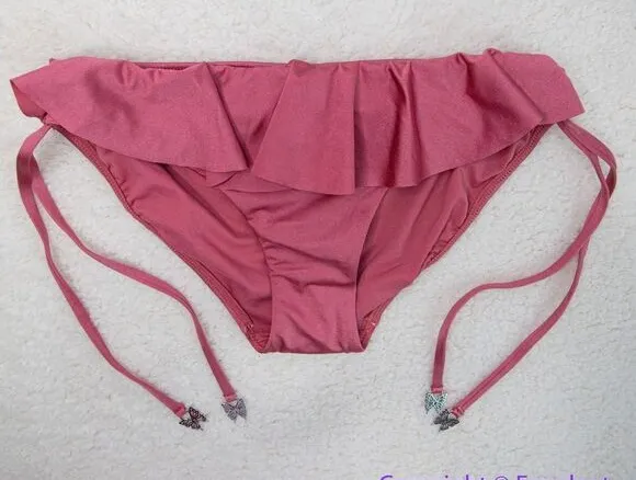 NEW Seafolly Womens Ruffled Side-Tie Hipster Bikini Bottom Swimwear in pink, US size 8 New without tags. Taking inspiration from the 70s, the Shine On Loop Tie Side Hipster Bikini Bottom by Seafolly features luxe fabrication and a high-shine finish. Walk from your towel to waves like you’re walking down a catwalk. - Tie side hipster style - Frill ruffle detail - Butterfly trim on side ties - Offers classic coverage Fabric: 74% Nylon/26% Elastane To ensure correct treatment, please refer to individual care labels on each product. Rinse after use. Cold gentle machine wash separately or hand wash with lukewarm water using mild detergent. Dry in shade. The measurements shown are approximate and are provided as a helpful reference, but not a guarantee of fit. The actual colors may vary due to differences in lighting conditions and computer monitor settings. Please note: stock photos in different color are provided for fit and style reference only. Bottom only, not a set. barbiecore