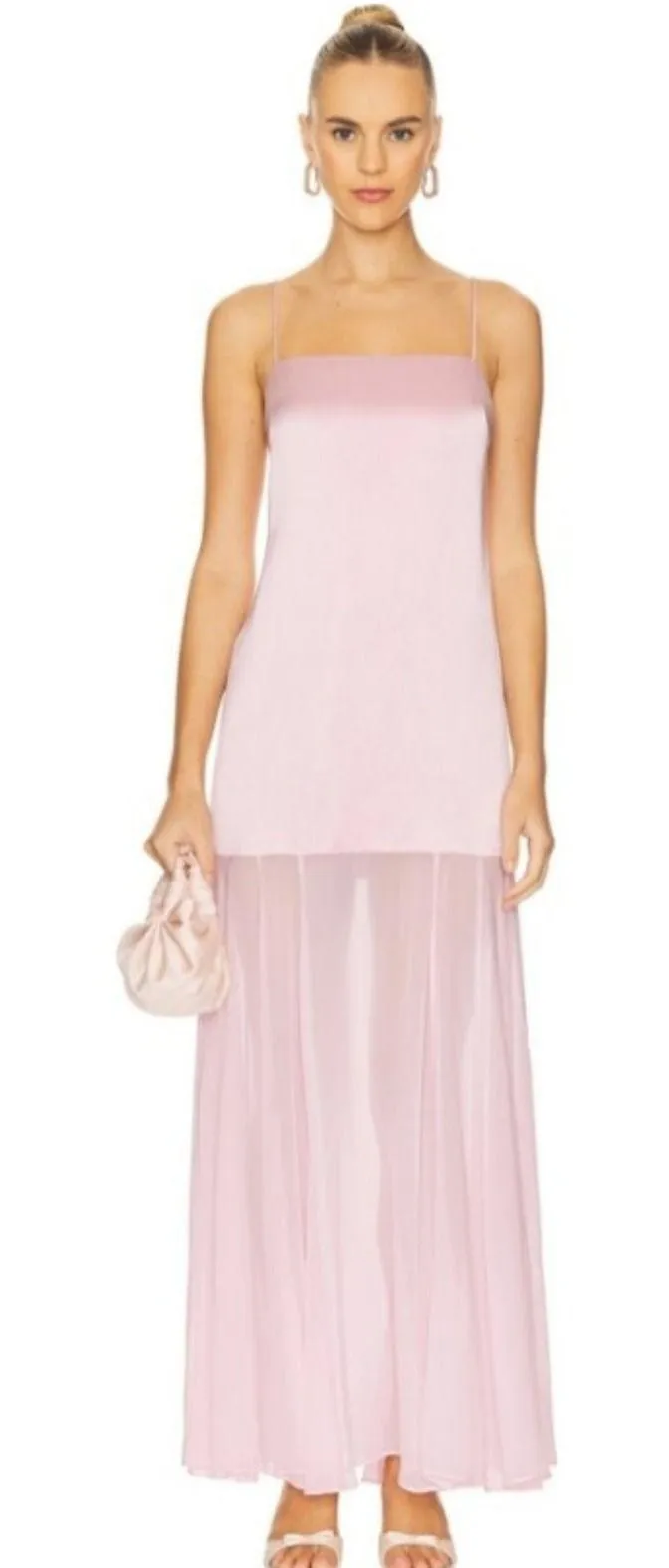 Flowing elegance defines this SHONA JOY slip maxi dress, designed to make you feel effortlessly chic. The smooth satin bodice gracefully drapes into a sheer, flowing tiered skirt, creating a beautiful silhouette that moves with you. Thin spaghetti straps and a flattering square neckline add a touch of delicate sophistication, perfect for making a statement at a summer wedding, a glamorous evening out, or a sophisticated vacation dinner. Measurements: • Bust: 19 in pit to pit • Waist: 20 in flat across • Length: 59 in Self: 55% polyester, 45% acetate Contrast Fabric: 100% viscose Lining: 100% polyester Unlined Hidden back zipper closure Satin fabric at bodice and flowy chiffon at skirt Revolve Style No. SHON-WD697 Manufacturer Style No. 1253034 sold out online! Revolve, designer, bridal shower, vacation, beach, cruise, bachelorette weekend, wedding, event, barbie, glam, summer, spring, trendy, blogger favorite, barbiecore
