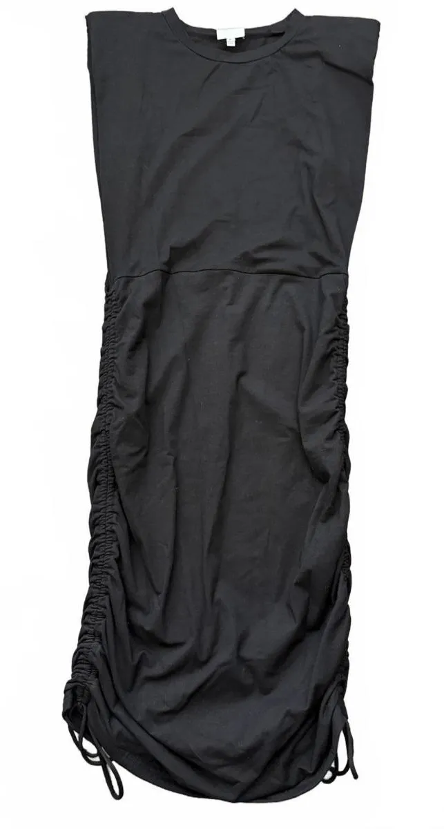 SKU: #O133 Brand: Skylar + Madison Size: Medium Item: Dress Condition: Brand New Color: Black Length: Midi (Below Knee) Material: Cotton Spandex Polyester Pattern: Solid Neckline: Round Closure: Pullover Sleeves: Sleeveless Care: Hand Washable Made In: China Description: Minimalist, Tapered, Side Drawstrings, Built-In Shoulder Pads, Spring, Summer, Women’s Wear, Women’s Clothing Measurements are approximate: Shoulder to Bottom: 40” Arm Pit to Arm Pit: 19” (Can stretch further) Sleeves: 0”