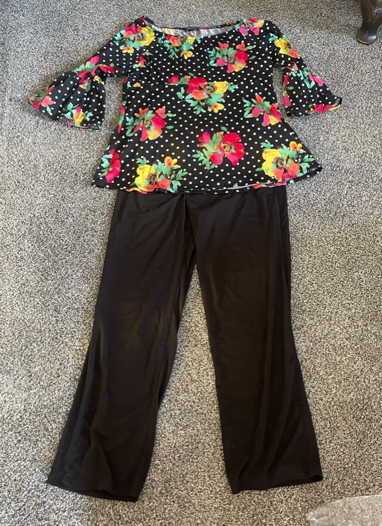 New in bag (opened for pics) Slinky Brand Comes with 1 Black Floral Polka Dot Blouse and 1 pair of black Pants Business Casual Outfit Set Large 95% polyester, 5% spandex Shirt: Approximate length=26 3/8 in Approximate pit to pit=20 in Approximate sleeve= 15 3/8 in Pants: Approximate length=39 3/8 in Approximate hip to hip=15 1/2 in Approximate inseam=26 7/8 in Approximate rise=13 3/8 in (high rise) Great condition BUT from my grandma’s house and likely will smell like her perfume Feel free to create a bundle or shoot me an offer! Smoke free, 1 dog home **might arrive wrinkly** Stylish floral blouse with black pants. Perfect for any occasion.