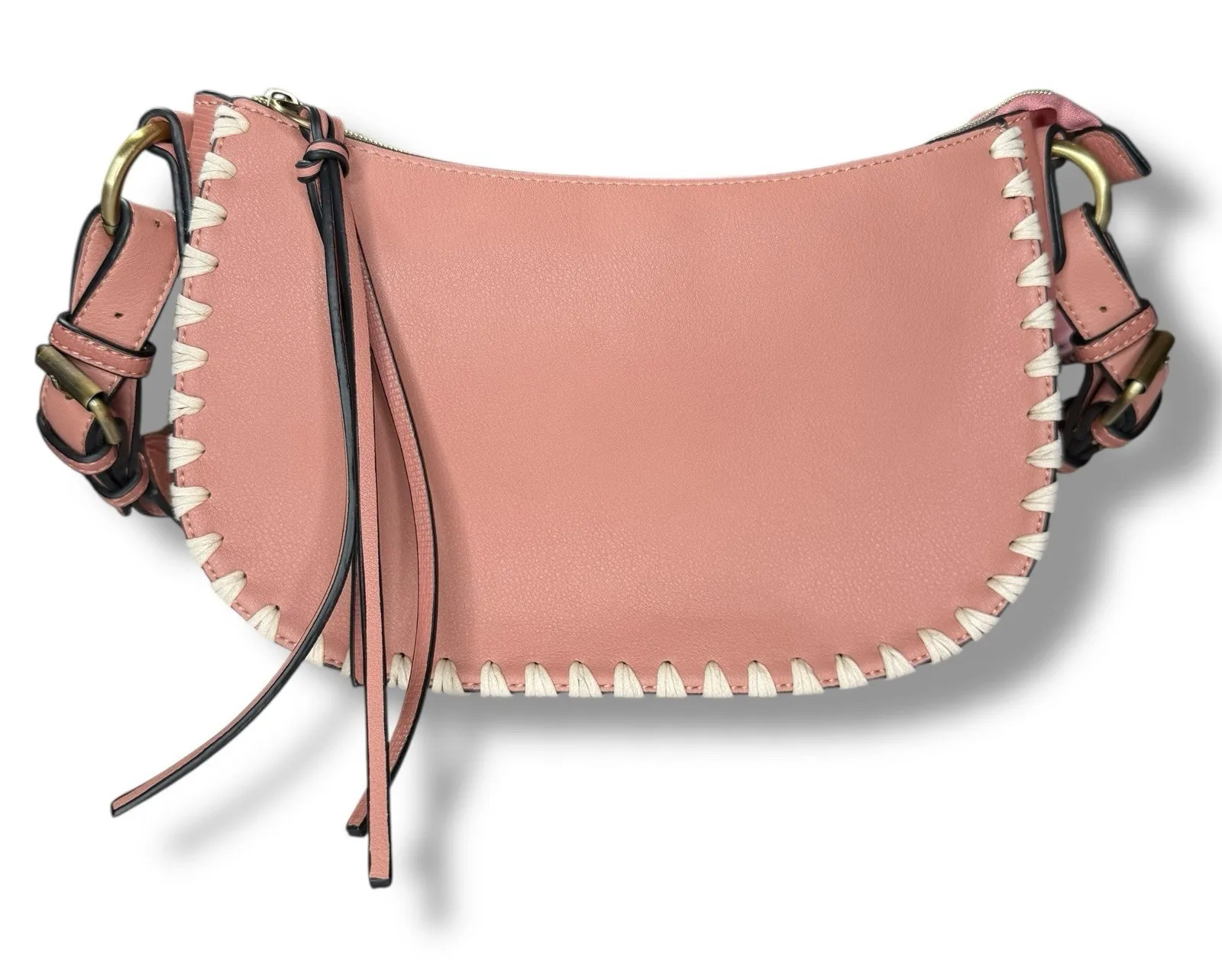Chic and modern, this Sondra Roberts Studio shoulder bag is crafted from soft blush-pink vegan leather with beautiful ivory whipstitch trim. The half-moon (crescent) silhouette gives it a refined, feminine shape, while the wide adjustable strap and antique brass hardware add a boho-luxe touch. Perfect for day-to-night wear with effortless style. Features: Style: Half-moon / Crescent hobo shoulder bag Color: Blush pink with ivory contrast stitching Material: Vegan leather (animal-friendly) Hardware: Antique brass tone Closure: Top zip Interior: 1 zip pocket, 2 slip pockets Exterior: Rear zip pocket with ring pull Strap: Adjustable shoulder/crossbody strap with buckle detail Lining: Gray and white pinstripe Tassel Rough measurements: 11x6.5x3, 13" drop Condition: Excellent — clean inside and out, never carried. A couple of tag indents on strap Ships within 24 hours Style keywords: vegan leather handbag, crescent hobo, boho chic, blush purse, minimalist design, quiet luxury, modern feminine, sustainable style, soft pink bag, everyday crossbody