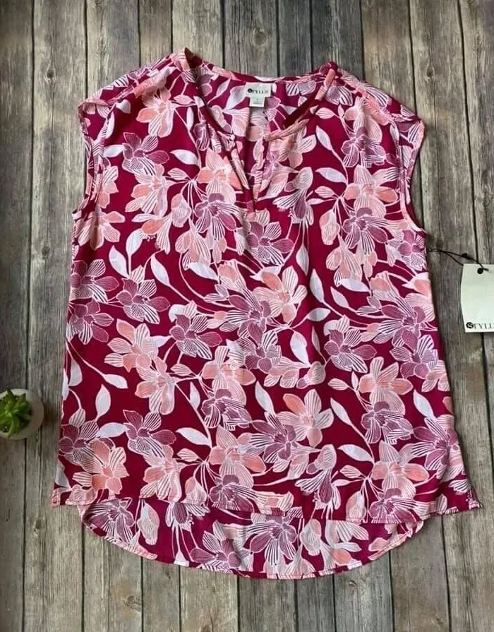 New with Tags ($36) Brand: Stylus from JC Penney Women's Size: Small (should work for Medium too) Color: Pink. Coral. White. Features: Slightly Sheer. V Neck. Material: Poly Chiffon Care: Machine Wash Bust - 40" doubled (no stretch) Length - 25" (front) to 30" (back) to longest hem