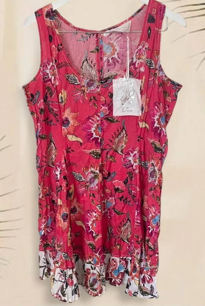 • New with tags • Tiki Coral - pink blue multi floral print • Large Stock image is the same style in a different color Lightweight 100% Cotton Sleeveless tank Keyhole button back Summer boho tropical vacation island cruise resort beach coastal loose flowy