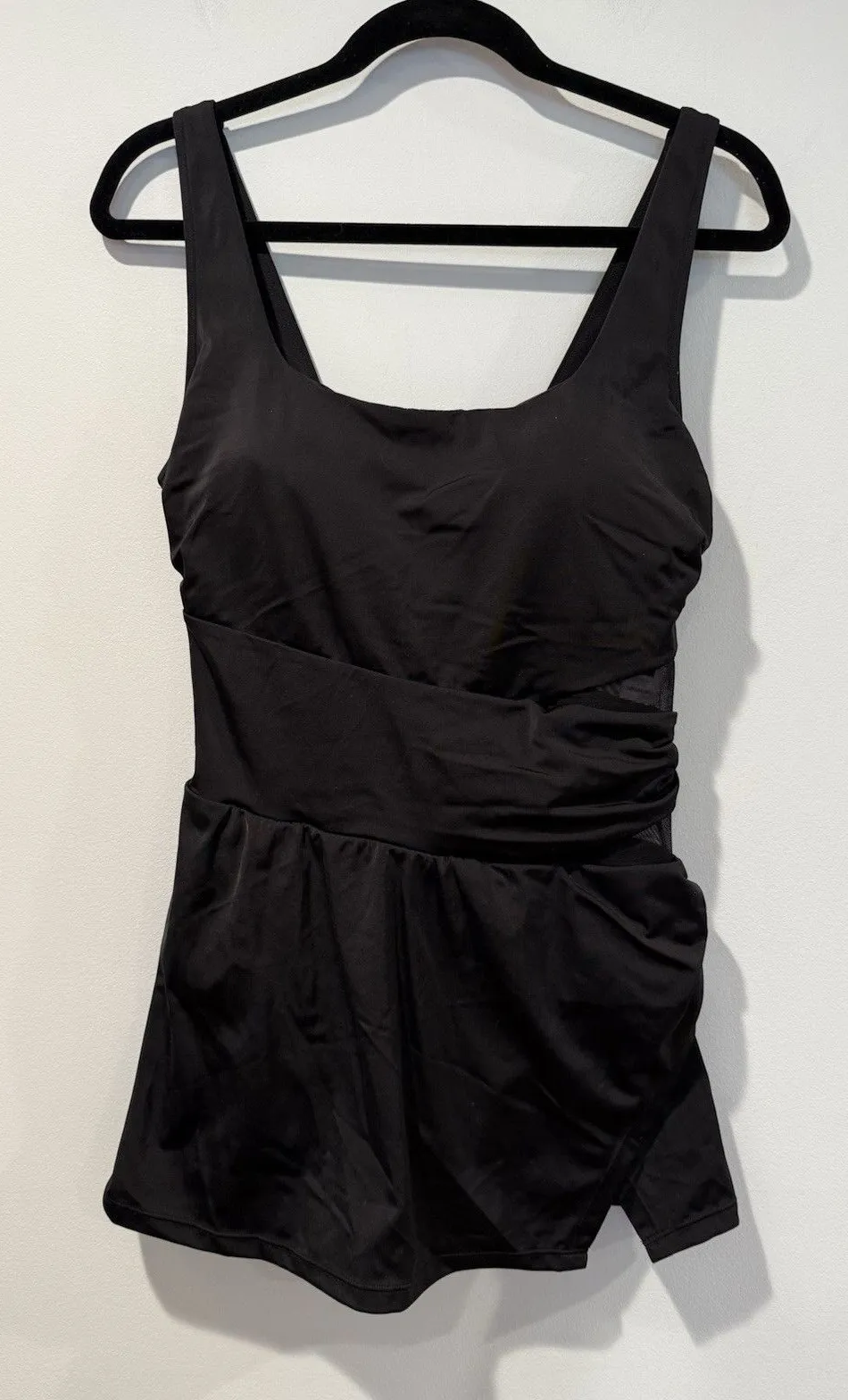 NEW Swimsuits For All Swimsuit Womens 10 Black Full Coverage One Piece 'Dress' Built in Bra Mesh Side Cut Outs · Size 10 · Materials 82% Nylon, 18% Spandex Measurements (Approx.) · Underarm to Underarm: 16 inches · Total Length: 28 Condition: New without tags, hygienic liner still attached