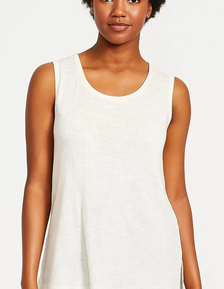 This item is brand new with tags White Pullover styling Slub knit on front with smooth knit on back Sleeveless Side slits Round neckline Classic fit Across chest - 17.5" Length - 26" Some photos may contain an AI-created model wearing the actual item to show fit. Ships from a smoke-free and pet-free environment Packaged with care Trusted seller; ships quickly Base Layer, Brunch, Corporate, Everyday, Layer, Layering, Minimal, Monochrome, Office, Packable, Polished, Preppy, Quiet Luxury, Refined, Timeless, Travel, Neutral, Practical, Simple, Gift, Present, Classic
