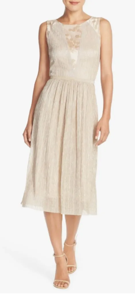Tahari Pleated Metallic Jacquard Illusion Midi Dress in Gold A floral-jacquard bodice in a lustrous... Show more