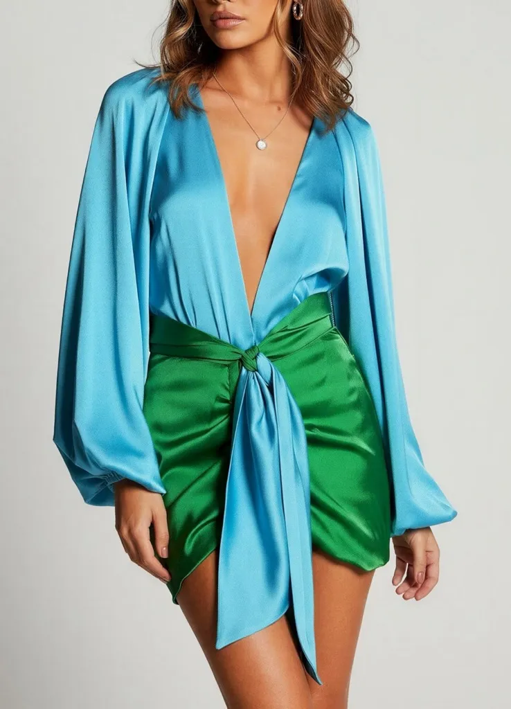 - New, No Tags, No Flaws - Orig: $170 - Color: Turquoise - Only top is available - Plunging neckline - Satin fabric - Long blouson sleeves Approx. Measurements: - Size: XS - Bust: 36” - Waist: 24” Actual item for sale is pictured using a mannequin. For sizing reference, our mannequin’s measurements: Shoulder: 17” | Bust: 35.5” | Waist: 26.5” | Hips: 38.5” | Height: 5’11