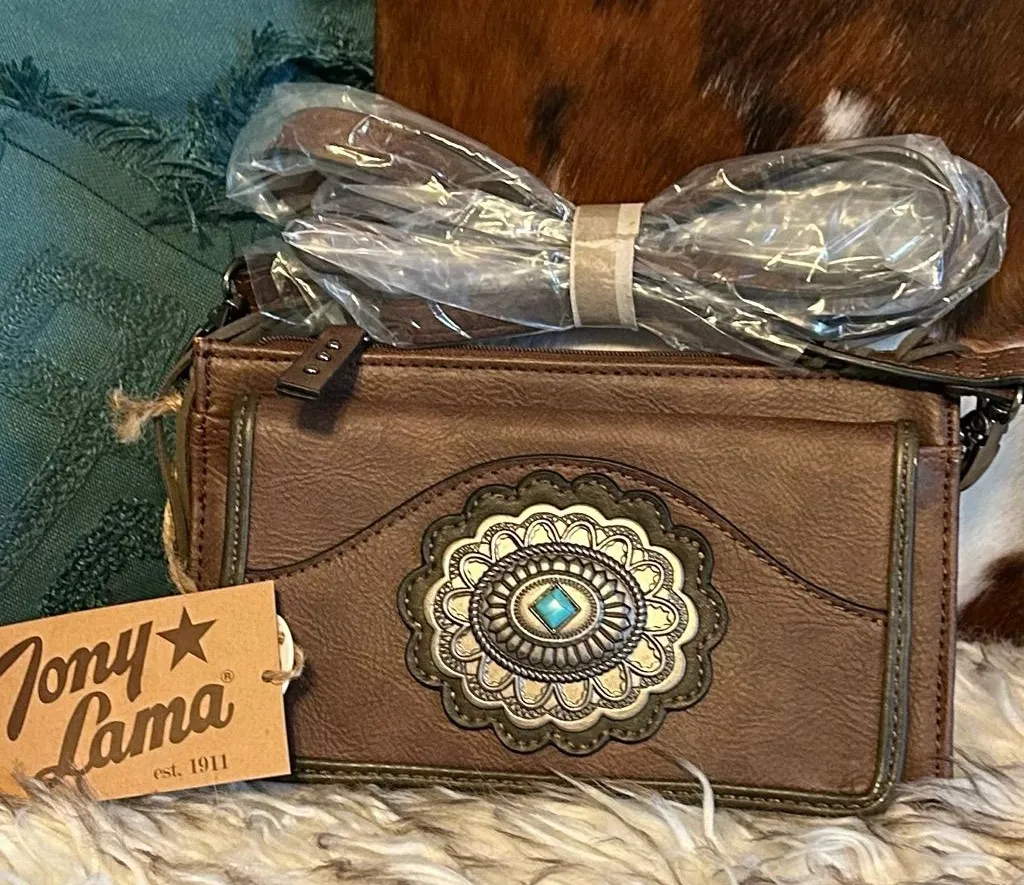 Elegant leather bag by Tony Lama. Features a classic design. This bag is perfect for adding the rustic charm of western to any everyday outfit .. weekend outing, concert etc.. Exterior Material: Leather Style: Crossbody / Wallet Accents: Western concho metal grommets, bolo tips, faux turquoise stone & detailed stitching. Features: Cross-Body Strap, Credit Card, Pockets, Removable Adjustable Strap & Carry as a wallet Closure: Zip, Magnetic, Snap -8"W X 1"D X 5"H Length: 19" - 24" adjustable RFID Protection