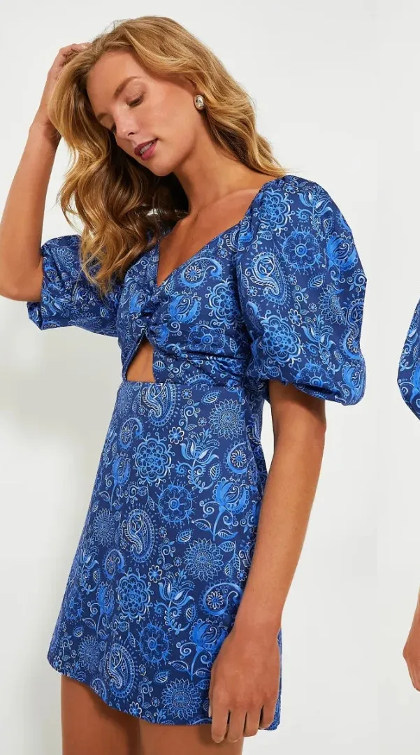 NWT Hyacinth House Blue Mod Paisley Bianca Mini Dress. Sassy and flirty, this Hyacinth House mini dress from Tuckernuck boasts a twisted bodice and cutout detail. A smocked back for the perfect fit, and elbow length puff sleeves to bring added structure to the silhouette. Sweetheart neckline. Elastic cuffs. Hidden zip at back. Straight hem. Size XXL. Brand new with tags. Lined. 100% Cotton (body)