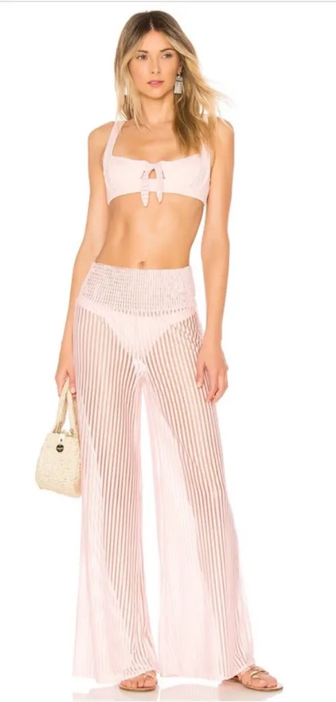 TULAROSA WIDE LEG LONG SHEER SALMON PINK STRIPED SHIMMER HIGH WAIST RISE PANTS SMOCKED WAIST Size:... Show more