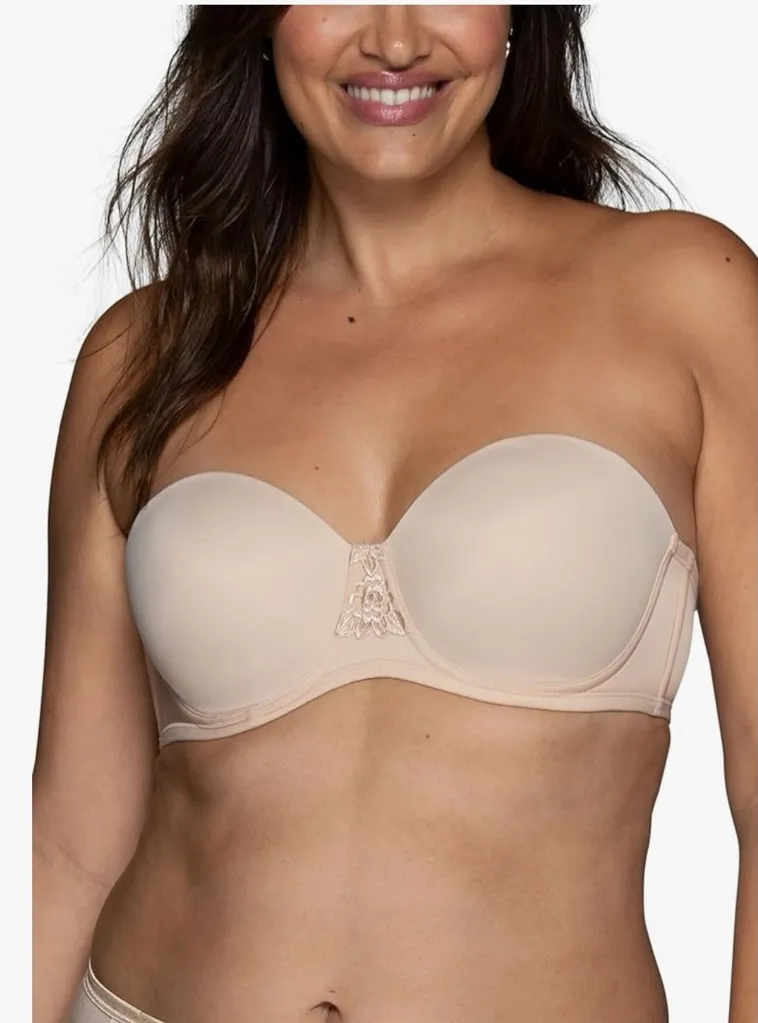 Beige Fabric type Cups: 78% Nylon, 22% Spandex; Backs: 80% Polyester, 20% Spandex Care instructions Hand Wash Only Origin Imported Closure type Hook & Eye About this item BEAUTY BACK FULL FIGURE UNDERWIRE STRAPLESS: Style 74380, with 4-way stretch fabric provides smoothing across the back FIT TIP: The band is designed to provide a snug, supportive fit. Start with the middle hook adjustment and adjust based on fit. If the band feels tight, a different band size may be needed NO SLIP SILICONE: No slip silicone underwire, wings, and back to hold against skin for no slipping SMOOTH, SEAM FREE CUPS: Padded and lightly lined cups provide modesty and great shape
