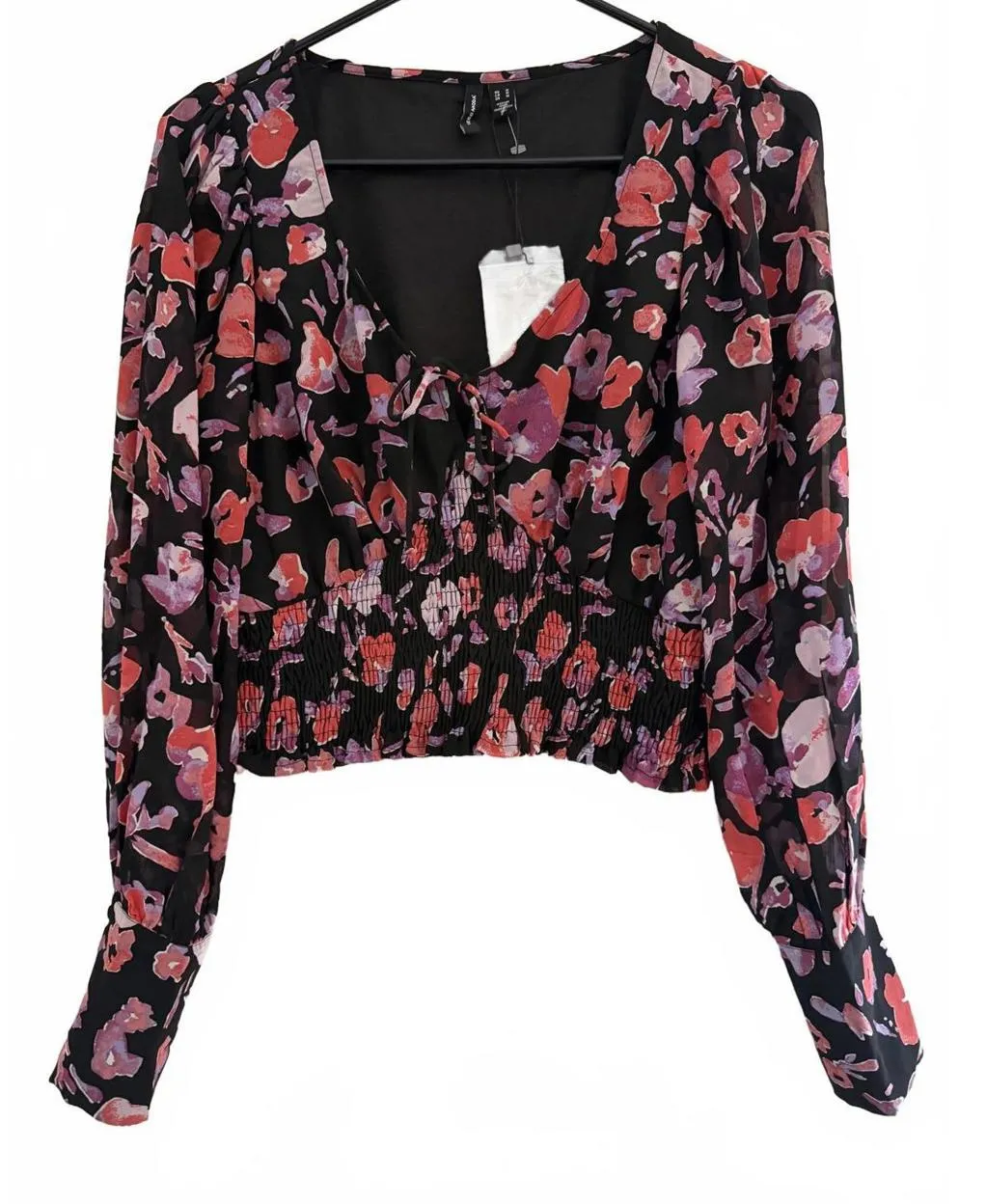 SKU: #O9 Brand: Vero Moda Size: Medium Condition: New Retail Price: $49 Color: Multicolor (Black Coral Purple Ivory Pink) Material: Polyester Pattern: Abstract Floral Neckline: V-Neck with Keyhole Opening Closure: Pullover with Front Tie Sleeves: Long, Sheer, Buttons Care: Machine Washable Made In: India Description: Cropped, Crop Top, Smocked, Colorful, Chic, Women’s Wear, Women’s Clothing Measurements are approximate: Shoulder to Bottom: 16” Shoulder to Shoulder: 14” Arm Pit to Arm Pit: 18” Sleeves: 24”