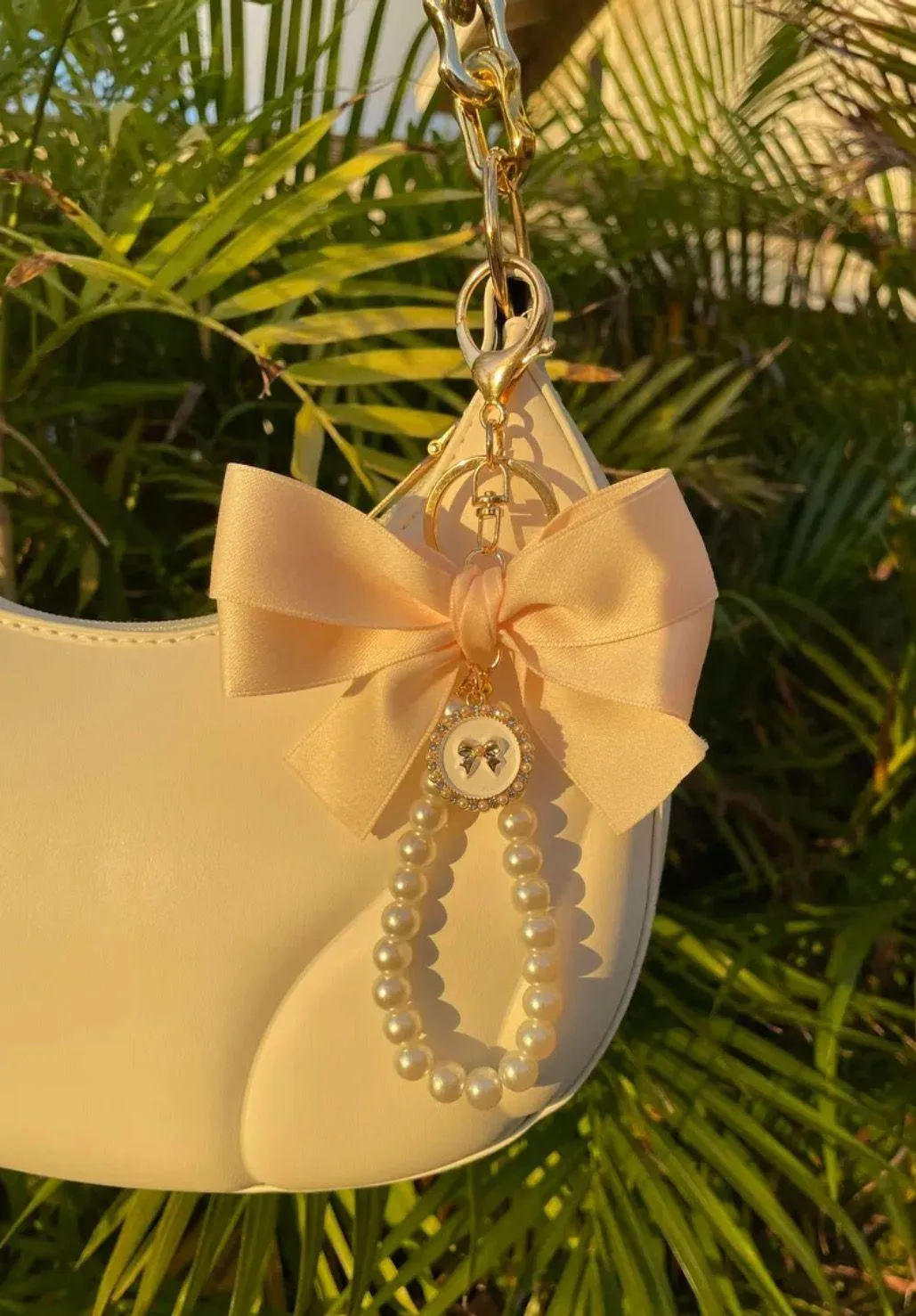 • NEW Cream Ribbon Bow + Gold Pearl & Rhinestone embedded Ribbon Pendant + Faux Pearl Beaded Strap • Gold Lobster Clasp w/key ring keychain Has a good weight to it • Keychain measurement- Length: 3.4 inches Width: 5.9 inches