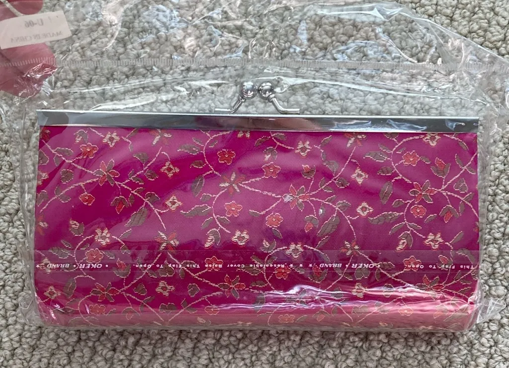 NEW Vintage Hot Pink Accordion Style Hard Case Snap Close Wallet SEALED 2005 Brand new still sealed in the original packaging vintage Chinese accordion style snap close hard case wallet in hot pink with embroidered / sewn flowers. Very pretty and delicate looking Purchased in approximately the year 2005 or perhaps even earlier; vintage Approximate measurements: Length 7” Width 3.5” Depth 1.25”