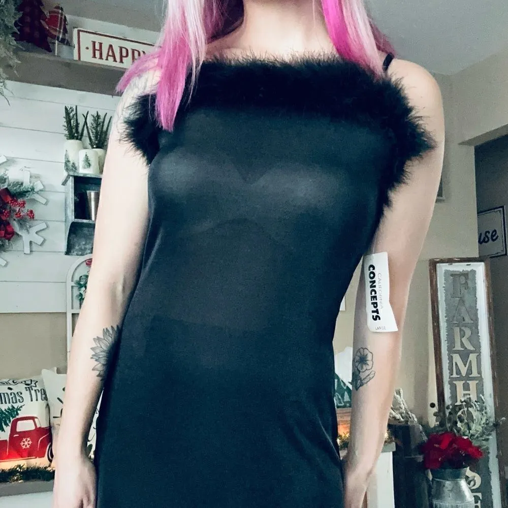 Elevate your wardrobe with this exquisite Deadstock Vintage California Concepts Black Boa Trim Slinky Dress. Impeccably crafted and brand new with tags, this piece seamlessly blends sophistication and retro charm. The luxurious boa trim adds a touch of glamour, making it a timeless ensemble for any special occasion. Don't miss the opportunity to own a rare, never-worn vintage gem that effortlessly captures the essence of California Concepts' iconic style. Amazing piece! Perfect 90s slinky material. Small keyhole button in back. Large slit in back as well. Has lots of stretch and is so flattering and comfortable. It is sheer as seen in pics. Size large Approx measurements lying flat Pit to pit 16.5” Length 47” 51.5” with strap Waist 16” Hip 19.5” New years holiday party glamour glamorous feather trim 90s Y2K sheer black tie elegant night out maxi long full length