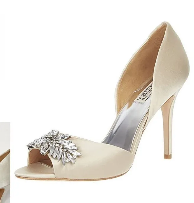 Womens Badgley Mischka Nikki Peep Toe Heels, White. These are beautiful off-white or bone colored satin shoes. Embellished with a large brooch across the toe. The diamonds are shaped to look like a butterfly almost with crisscross tiny diamonds on the top. I love these! 4 inch heel. There are some tiny smudges but they are very hard to see. I tried to capture some in pictures. Never worn. New without tags.