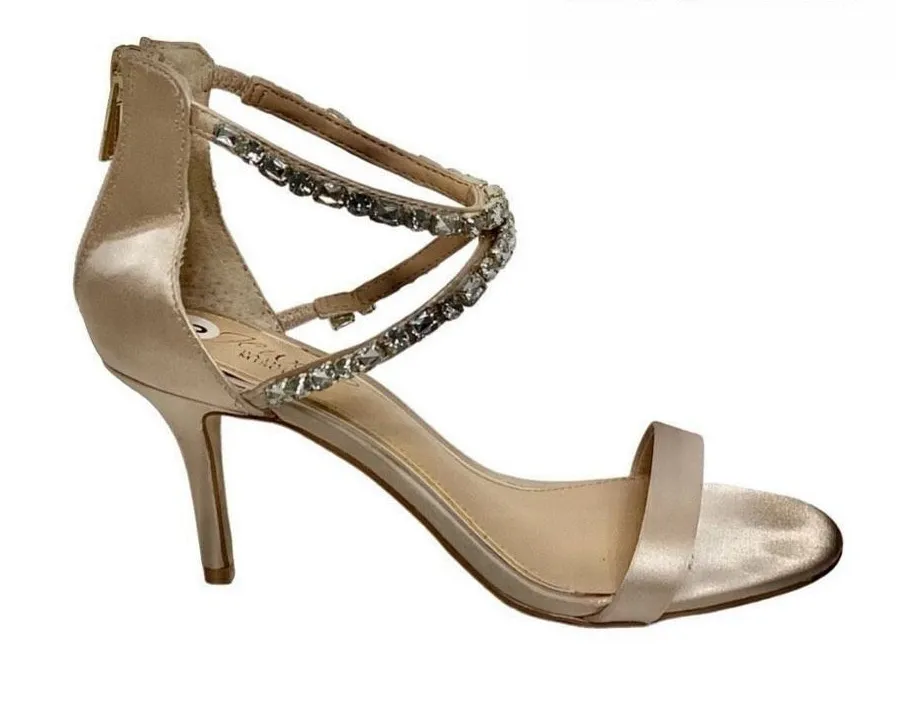 New. Badgley Mischka sandals/Heels, cream. These are beautiful cream/nude colored satin shoes. Embellished with faux diamonds that form the ankle straps. I love these! 3 inch heel. There are normal imperfections from trying on but they are very hard to see. Never worn. New without tags or box.