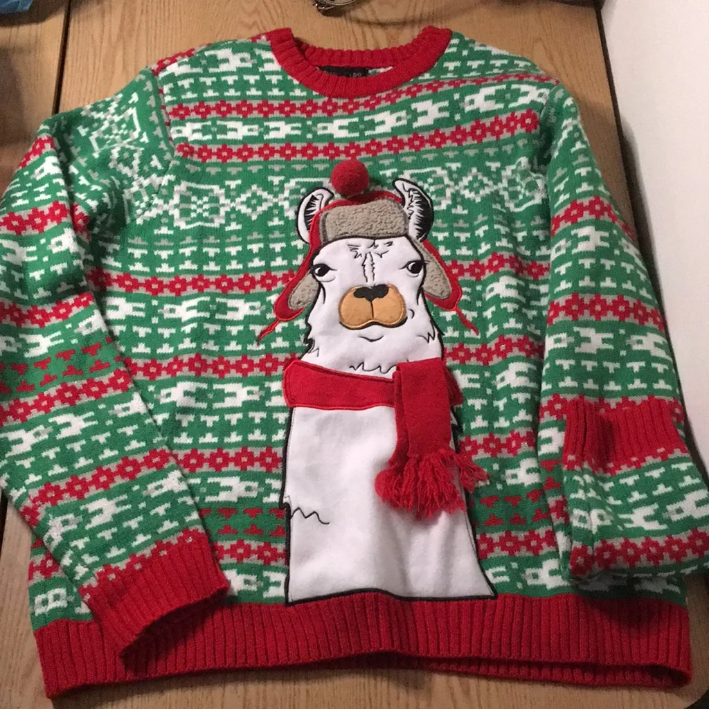 New Women’s Festive Llama 3-D Christmas 🤶 Ugly Sweater Red & Green Size X-Large Super stretchy soft lightweight and comfy Celebrate the holidays with this fun llama sweater. Features a festive design with a cozy scarf and hat. Perfect for holiday parties