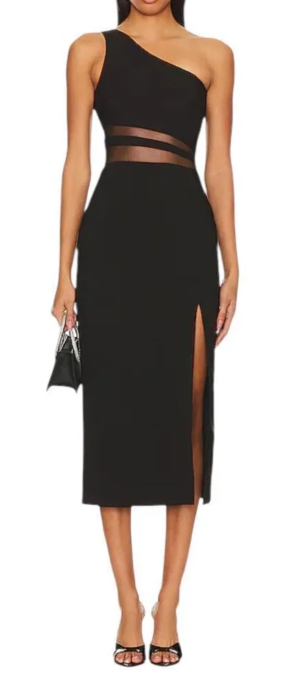Likely Midi Nolita Dress Partially lined, Hidden side zipper closure, Unlined mesh bodice detail, One-shoulder style bengaline fabric with side slit Size: 12 Color: Black Condition: New With Tags Smoke Free Home