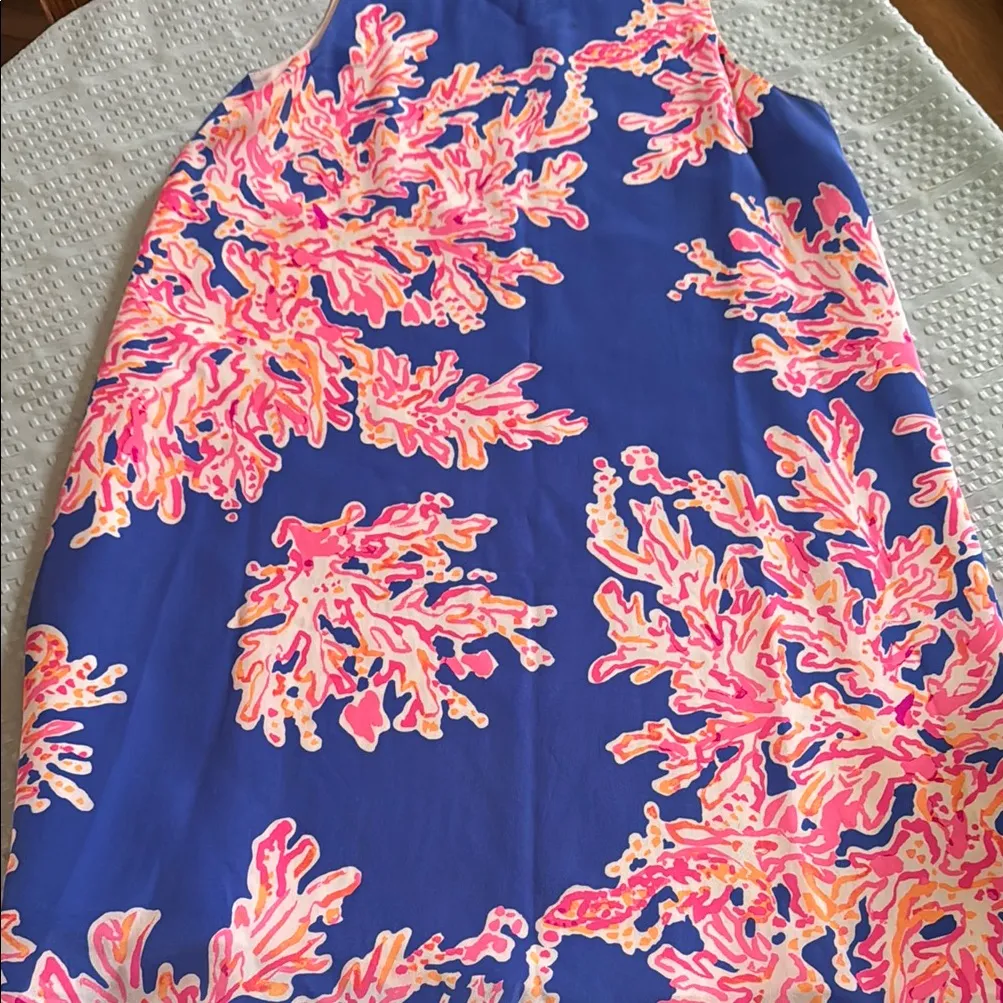 New Womens Lilly Pulitzer Blue & Pink Tropical Coral Print Silk lined Dress size Xs 17” ptp Fit s... Show more