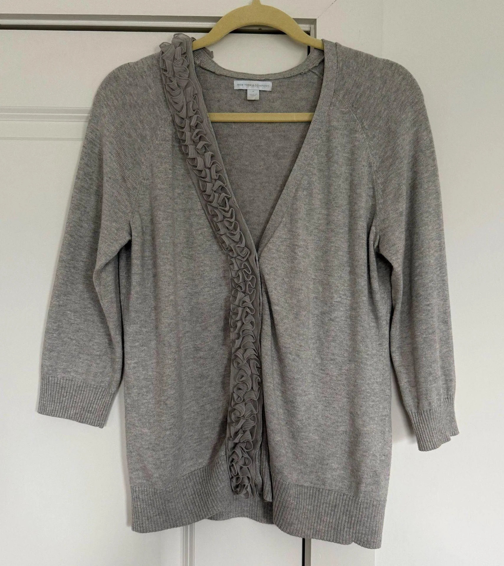 Light grey 3/4 sleeve cardigan Ruffled pattern on right side lining - runs from behind the shoulder... Show more
