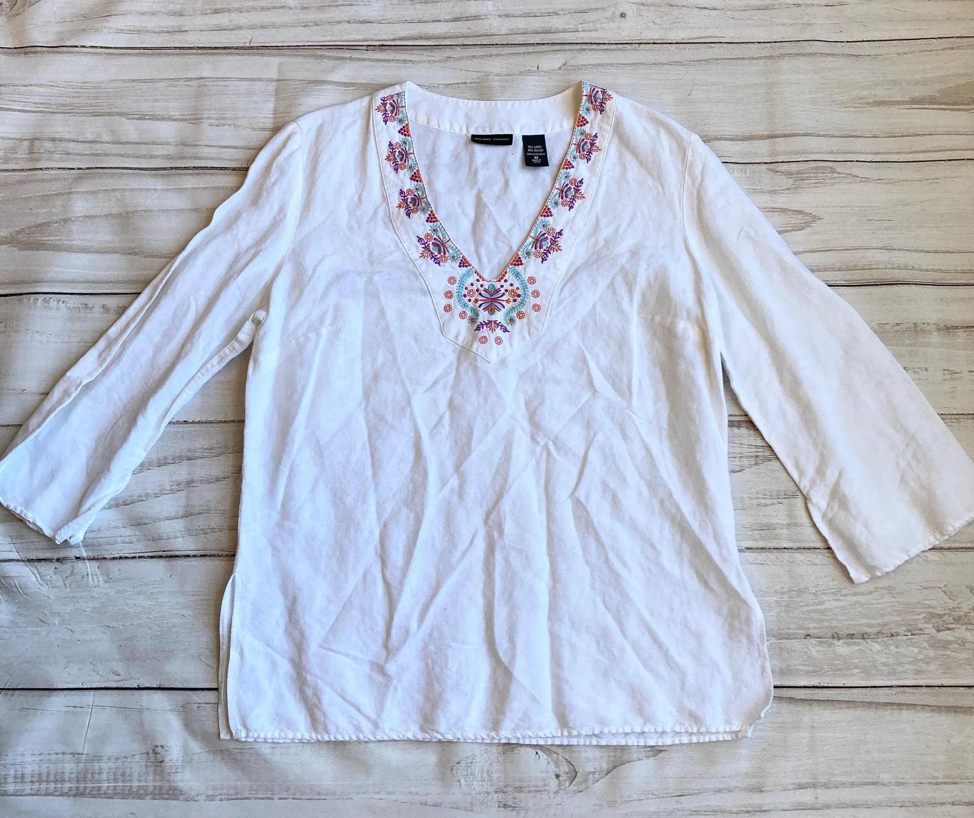 New York & Company White Linen Blend Embroidered Western Top; excellent condition -emrboidered -sof... Show more