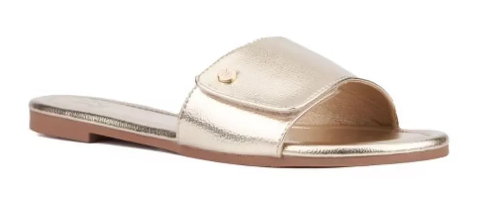 P3 Product Details COLOR SOLD OUT ONLINE….GET IT HERE! A shimmery metallic finish illuminates the Adelle sandal, accented by a polished stud detail and finished with easy fastened closure. The flat slide silhouette ensures comfort and ease of wear. Upper: 100% Faux Leather Outsole: 100% Rubber Lining: 100% Faux Leather Heel Height: 1" Stay Put Spot clean Imported NWT IN BOX FAST SHIPPING