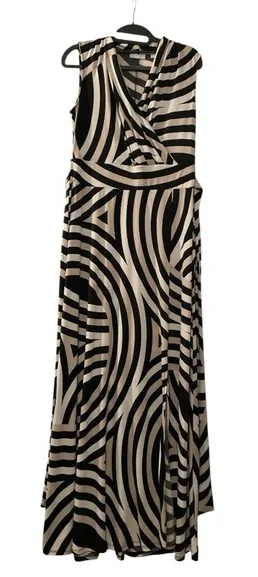 Elegant short sleeve stretch maxi dress with bold black and cream design. Perfect for evening wear.... Show more