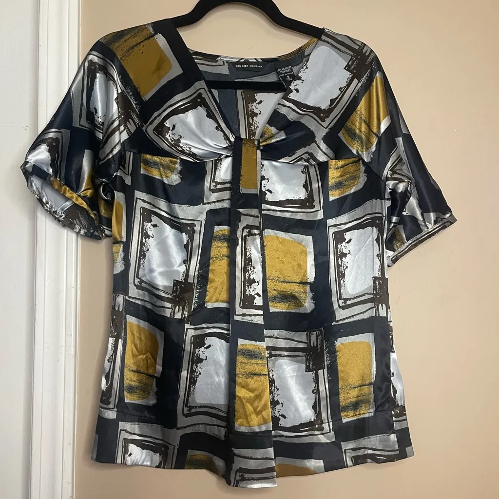 Stylish blouse with a striking geometric pattern. Features black, gold, and gray colors. -No rips o... Show more