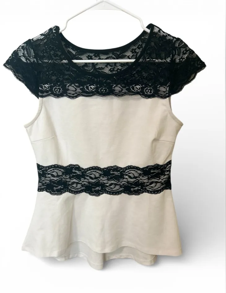 New York & Company black and white lace peplum top in excellent used condition with no notable flaws. Features delicate black floral lace overlay at the neckline and waist, a flattering fitted bodice with peplum hem, and a fully functional side zipper for easy wear. This top is perfect for office wear, business casual, work outfits, date night, dinner, or events. Classic black and white color palette makes it easy to style year-round with trousers, skirts, or jeans. Details: • Brand: New York & Company • Size: Medium • Color: White with black lace detail • Condition: EUC (excellent used condition) • Closure: Functional side zipper (shown in photos) • Style: Peplum, lace overlay, fitted, feminine, classic Measurements (laid flat): • Pit to pit: 16” • Length: 23.5” front | 25” back