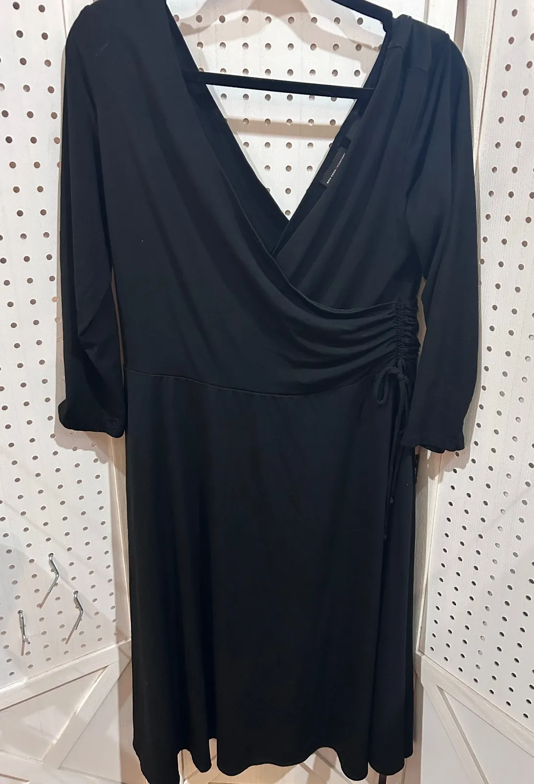 A versatile black wrap dress from New York & Company. This dress features a flattering V-neckline, long sleeves, and a stylish ruched detail with a tie on the side for an adjustable fit. The silhouette is designed to flatter various body types, making it a go-to piece for many occasions. Perfect for a business casual office setting, a dinner date, or a sophisticated evening out. Style: Wrap Dress Dress Length: Midi Department: Women Sleeve Length: 3/4 Sleeve Pattern: Solid Occasion: Casual, Party/Cocktail, Workwear Material: Polyester, Spandex Fabric Type: Knit Theme: Classic Neckline: V-Neck Season: Spring, Fall Sleeve Type: Roll Tab Sleeve Closure: Pullover Accents: Ruched Features: Ruched