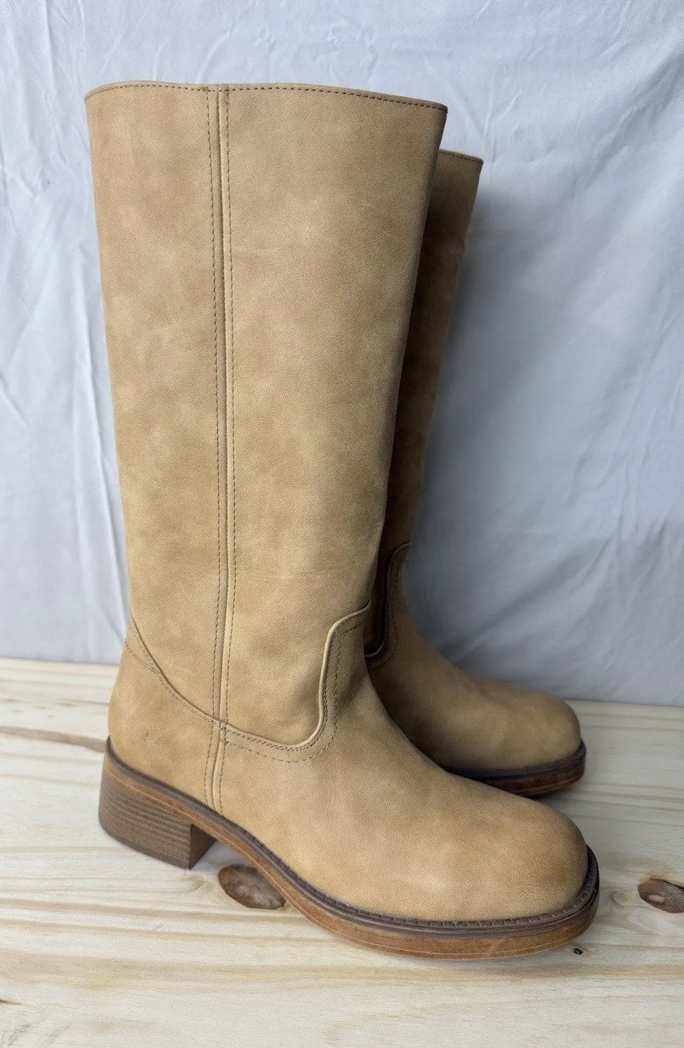 New York & Company women’s knee high boots, size 10, in tan/beige faux leather. These boots are new without the original box and feature a side zipper for easy on/off, along with a stacked block heel for all-day comfort. Perfect for pairing with jeans, leggings, skirts, or dresses for a classic, versatile look. Please check the texture of the boots, as natural variations may appear in the faux leather.