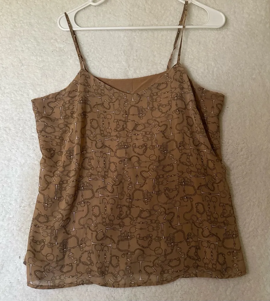 Size: M Measurements in pics Brown/tan chain-print spaghetti strap blouse with a flattering scoop neckline. Lightweight and flowy with a subtle sheen perfect for dressing up or down. Gives luxury designer / Y2K vibes and pairs so well with low-rise jeans, trousers, or a mini skirt. Neutral brown color makes it super easy to style year-round. Great for going out, office wear, vacation, or everyday wear. #2010s #y2k #coquette #officesiren #officewear 0188