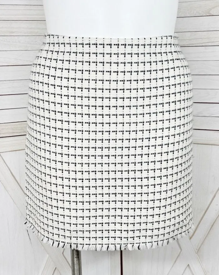 New York & Company Check Fringe Hem Tweed Pencil Skirt White Black Size 12 White with geometric br... Show more