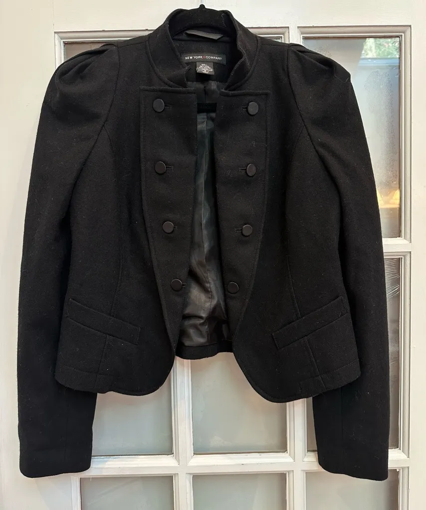 Stylish black blazer with double-breasted design. Features structured shoulders and front pockets. Ideal for a polished look. Great, preowned condition, no found flaws Smoke free home