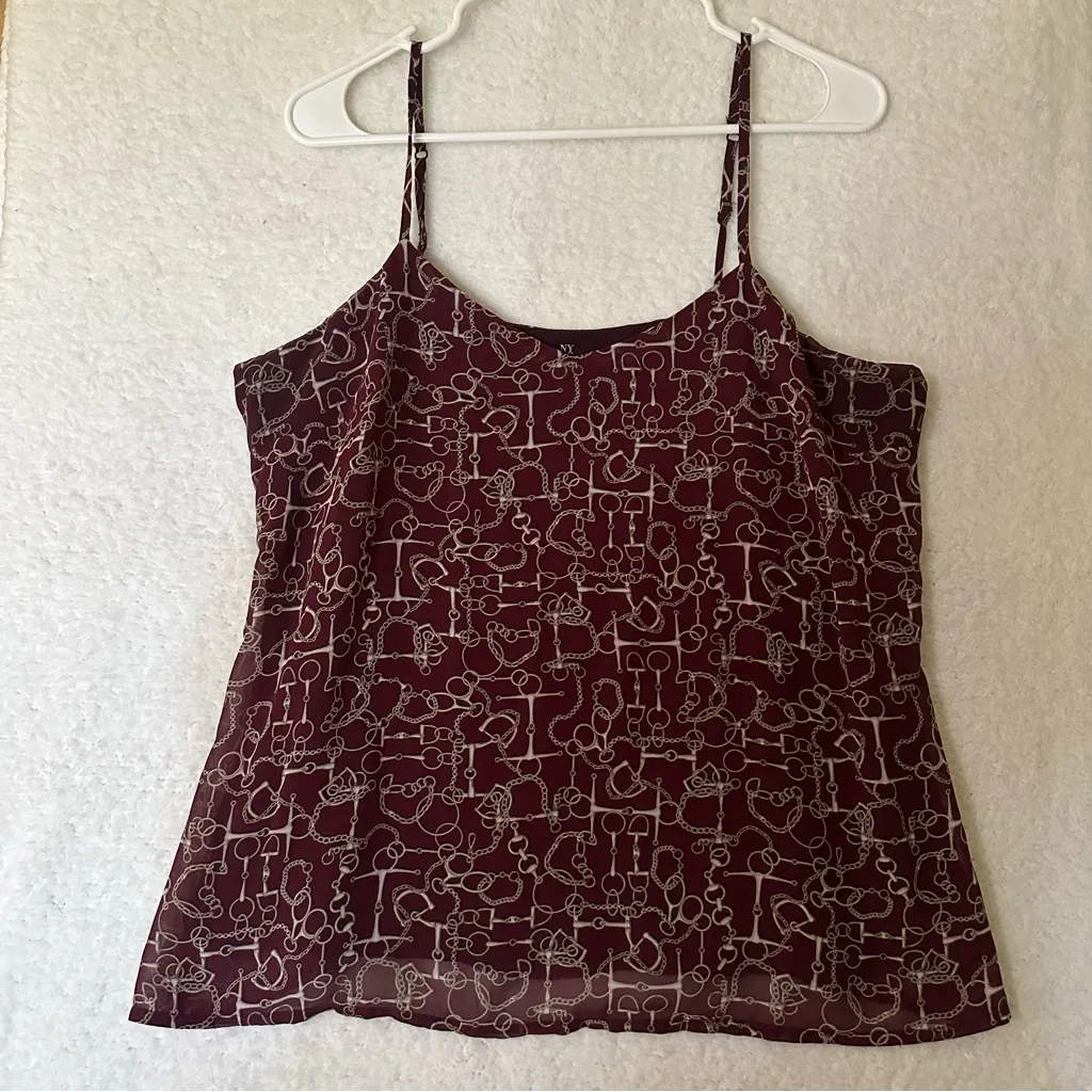 Size: M Measurements in pics Chic burgundy camisole by New York & Company featuring an all-over chain/bit print that gives major equestrian + Y2K vibes. Lightweight and flowy with adjustable spaghetti straps — perfect for layering or wearing solo. Details -Color: deep burgundy / wine red -All-over chain / equestrian-inspired print -Spaghetti straps -Scoop neckline -Flowy, slightly sheer chiffon-style fabric -Fully lined for coverage Perfect with low-rise jeans, trousers, or a mini skirt. Great for Y2K, office-to-night looks, or layering under a blazer or cardigan 0117 #y2k #officesiren #cami #coquette #cottagecore