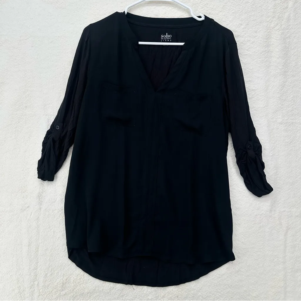 Size: M Measurements in pics -V-neckline for a flattering silhouette -Long sleeves with roll-tab button detail -Two chest flap pockets -Slight high-low hem -Button-back keyhole closure This New York & Company blouse blends utility chic with effortless polish. The roll tab sleeves and chest pockets give it a casual edge, while the flowy fabric and V-neckline keep it elevated. Perfect for work-to-weekend styling tuck it into high-waisted trousers for a clean office look, or pair with denim cutoffs and gold hoops for a soft grunge vibe. #officesiren #coquette #cottagecore #newyorkandcompany #2010s