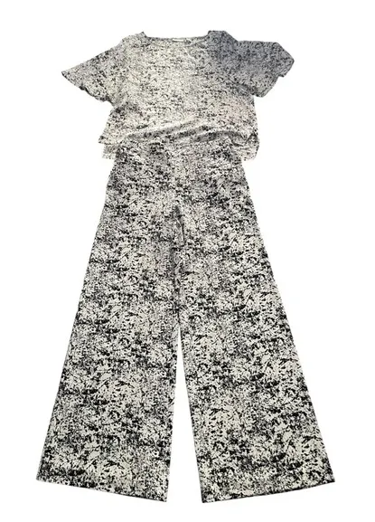 Stylish 2 wide-leg pant with a black and white speckled pattern,Features a relaxed fit and short sleeves. Ideal for versatile wear. In great condition PANT WIDE-LEG SIZE S BLOUSE SHORT SLEEVE SIZE M