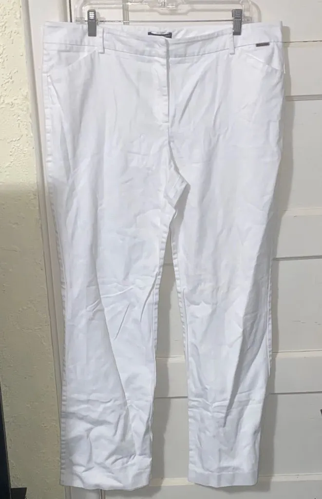 These have been worn 2 times, no imperfections but there is some wrinkles from storage. -White -Denim -Jeans -Wide Leg -Zip Up -Clasp -Business Casual -4 Pockets -Size 16 Tall -98% Cotton -2% Spandex -Made In China