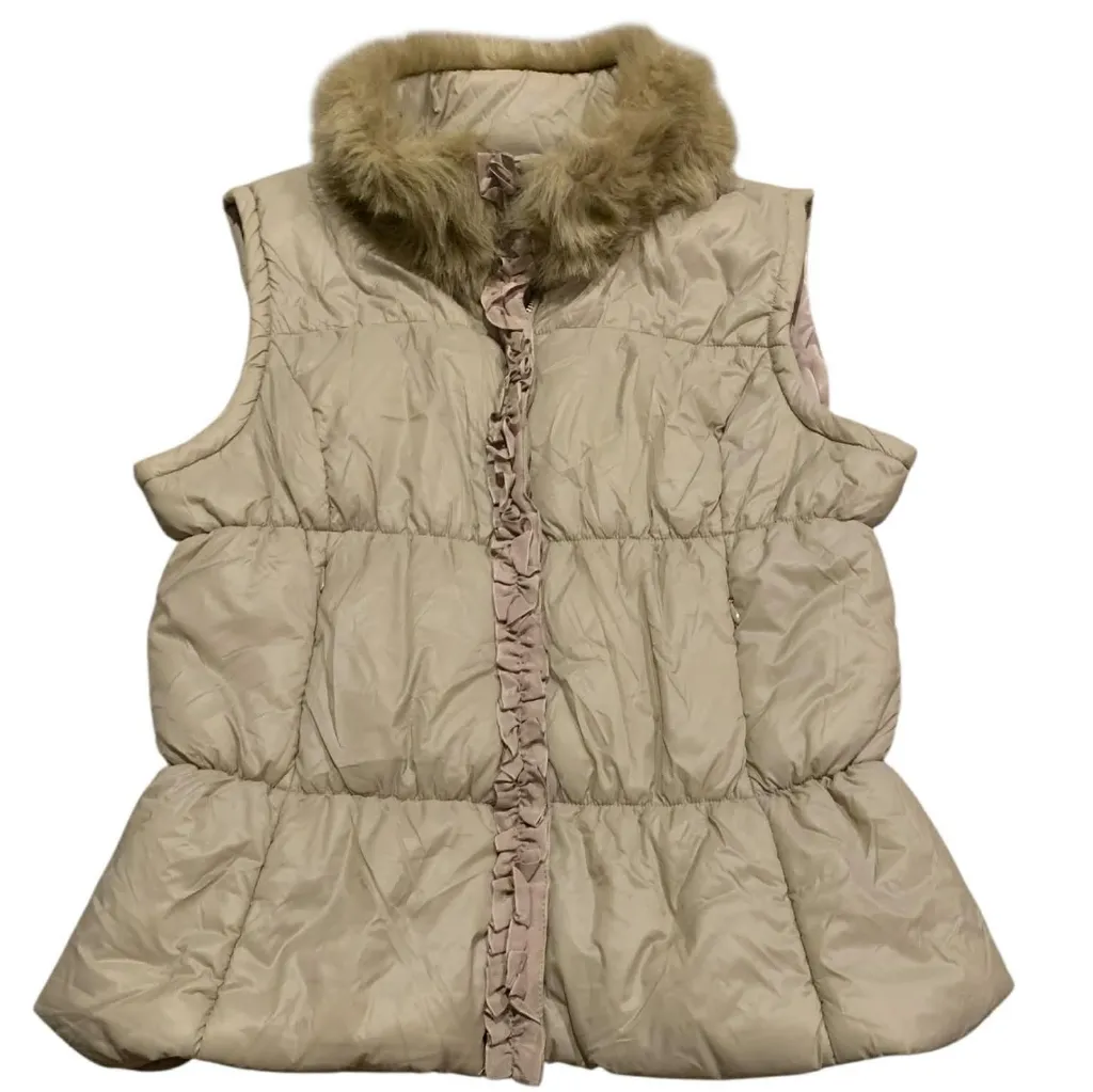 Brand: New York & Company Size: XL Color: Champagne Tan / Beige Aesthetic: Coquette, Soft Girl, Royalcore, Winter Chic Fabric: 100% Polyester shell & fill, faux fur collar Features: Hidden full zip with ruffles, elasticized peplum waist, and cozy high neck Condition: Gently worn, no visible flaws Shipping: Same/Next Day