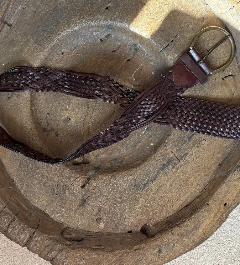 Wide woven brown leather belt with brass buckle. Great to cinch a shirtdress. From New York & Co. Me... Show more
