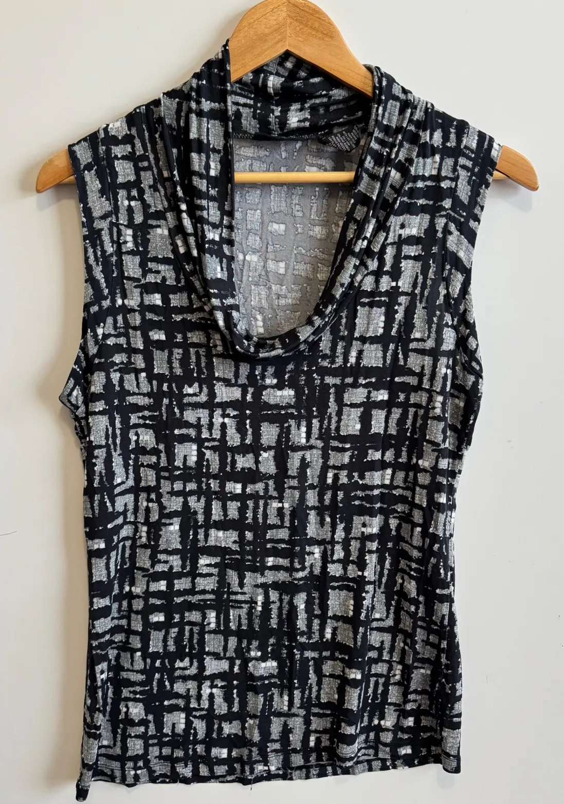 Chic sleeveless top, perfect for adding a touch of modern sophistication to any outfit. This top features a stylish cowl neck that drapes elegantly. The abstract pattern in black and gray adds a contemporary edge, making it versatile for both casual and dressy occasions. It is made from a stretchy and comfortable fabric that ensures a flattering fit. The sleeveless design is ideal for layering or wearing on its own during warmer weather. A great addition to any wardrobe. Chest 19" Length 27" Keywords: New York & Company, stretch top, sleeveless top, cowl neck top, abstract pattern, black gray top, womens top, rayon top, casual top, dressy top, modern top, comfortable top