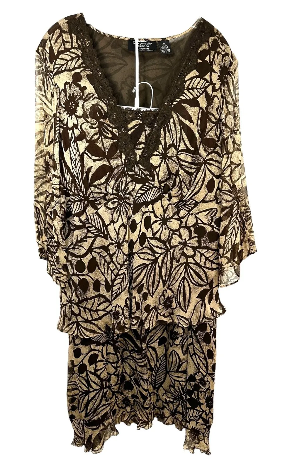 Elegant two-piece outfit featuring a sheer, flowy design with a sophisticated floral pattern in brown and beige tones. The set includes a long-sleeved top with a V-neckline accented with delicate lace trim and a matching skirt with a comfortable elastic waistband and a ruffled hem. The top and skirt have a light and airy feel, perfect for creating a graceful silhouette. Ideal for special occasions like evening parties or formal events, this outfit also transitions nicely to semi-formal gatherings or date nights. Chest: 31" across Waist: 21" across Hips: 31" across Blouse Length: 30" Skirt Length: 35" Color: Brown Department: Women Set Includes: Skirt, Dress Number of Pieces: 2 Piece Material: Silk Lining: Polyester Aesthetic: Floral Fantasy, Elegant Era, Retro Romance, Vintage Vibes, Romantic, Bohemian, Vintage, Floral Season: Fall, Spring Fabric Type: Chiffon Occasion: Party/Cocktail, Formal Keywords: floral dress, sheer top, brown beige outfit, plus size, new york city design co, 3X dress, women's clothing, special occasion, party dress, evening wear, lace trim, bohemian style, vintage inspired, silk dress Very good, pre-owned condition! Smoke-free, pet-free. Ships within 1 to 2 business days. Save the planet. Shop second hand